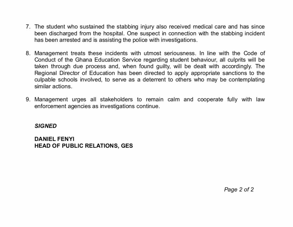 The attack is alleged to have been carried out by students of New Juaben Senior High School. The victim has received medical treatment and has been discharged. One suspect has been arrested and is assisting police investigations.