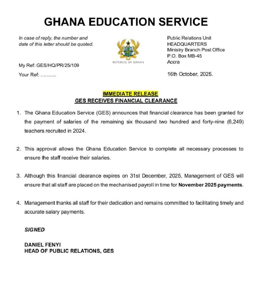 The Ghana Education Service (GES) has received financial clearance to settle outstanding salaries owed to 6,249 teaching and non-teaching staff who were recruited in 2024.