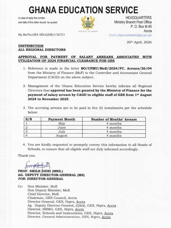 The Ghana Education Service (GES) has announced that approval has been granted for the payment of salary arrears owed to eligible staff, following the utilisation of the 2024 financial clearance.