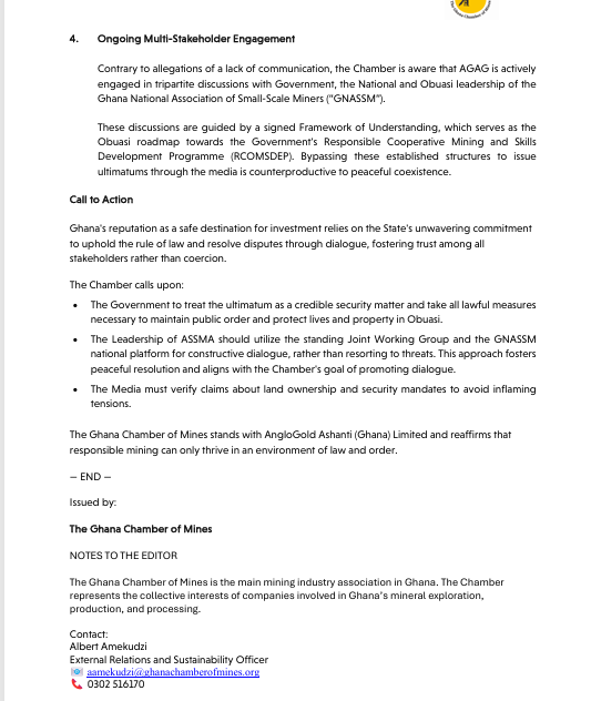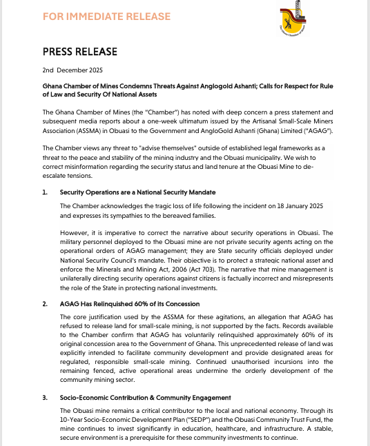 In a statement dated December 2, 2025, the Chamber warned that any attempt by groups to “advise themselves” outside legal frameworks poses a serious security risk. It also sought to correct what it called misinformation surrounding security operations and land ownership at the Obuasi mine.