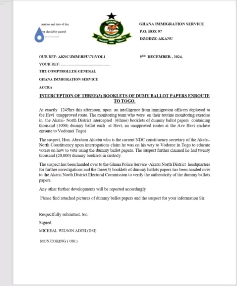 Immigration officials in the Akatsi North District have intercepted three booklets of dummy ballot papers allegedly being smuggled to Togo via an unapproved route at Hevi.
