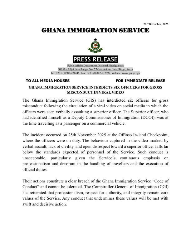 The Ghana Immigration Service (GIS) has interdicted six officers for gross misconduct after a video circulating on social media showed them verbally assaulting a superior officer.