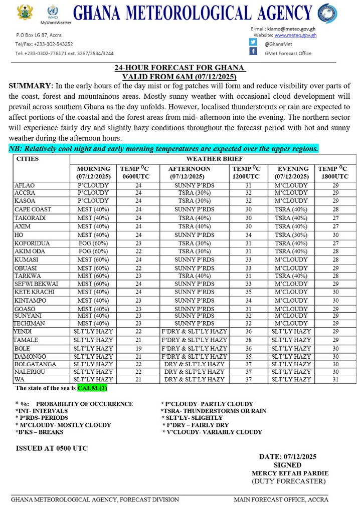 The conditions are expected to clear as the day progresses, giving way to mostly sunny weather with periods of cloud development across southern Ghana.