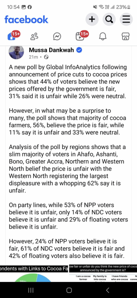 Conversely, 24% of NPP supporters, 61% of NDC supporters and 42% of floating voters said the new cocoa prices are fair.