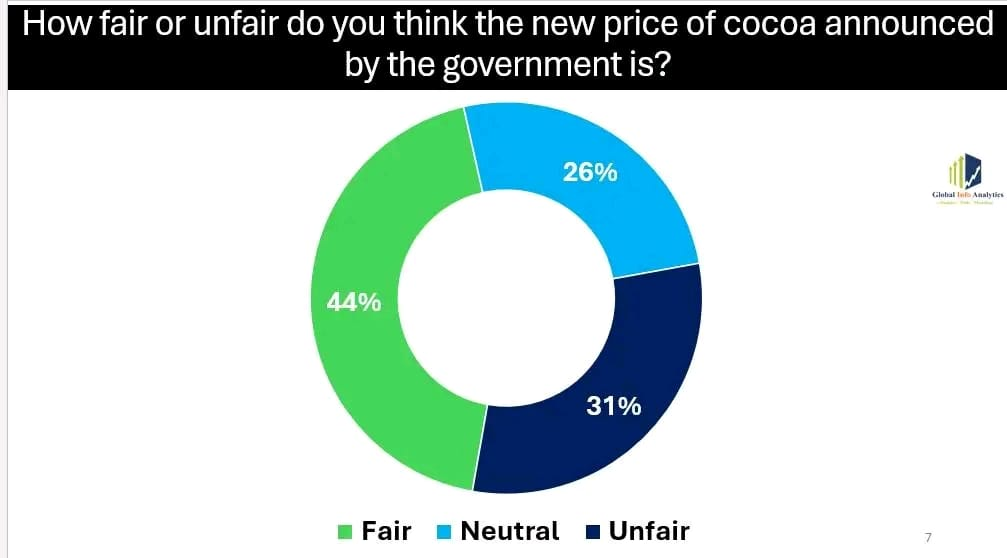 The survey, released on February 25, 2026, indicates that 44% of voters consider the new cocoa prices fair, while 31% describe them as unfair and 26 per cent remain neutral.