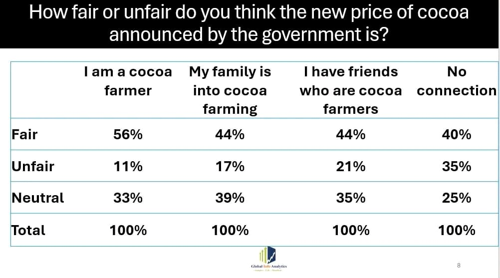 Among cocoa farmers, however, 56 per cent believe the prices are fair, 11 per cent see them as unfair, and 33 per cent are neutral.