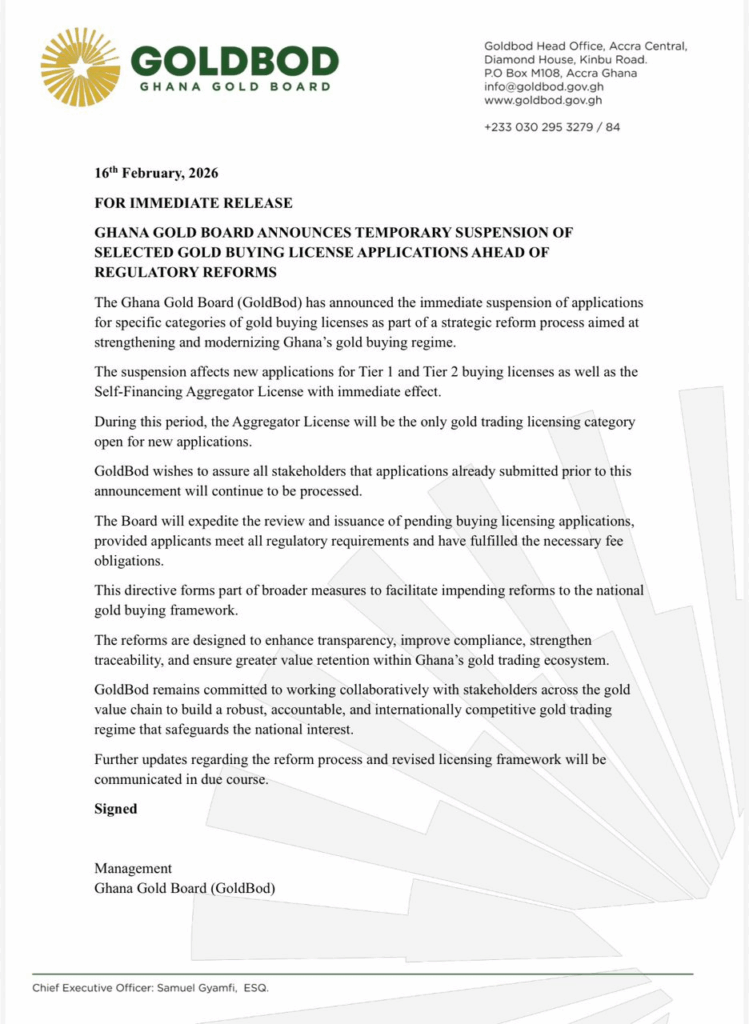 In a statement issued on February 16, 2026, GoldBod said the suspension affects new applications for Tier 1 and Tier 2 Buying Licences, as well as the Self-Financing Aggregator Licence.