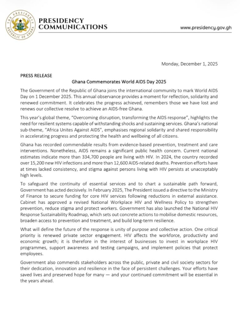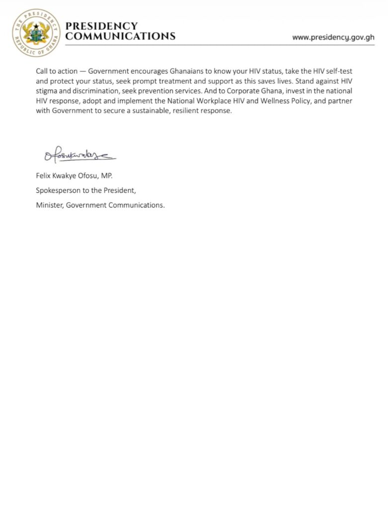The statement, signed by Minister for Government Communications Felix Kwakye Ofosu, emphasised that Ghana’s progress depends on collective action to build a future where HIV no longer impedes national development.
