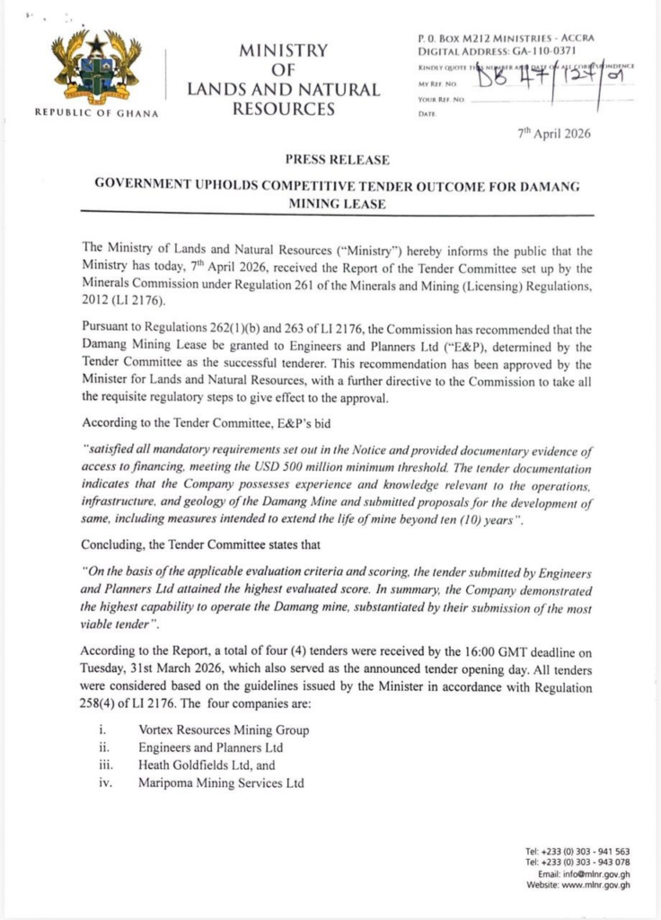 In a press release dated April 7, 2026, the Ministry announced that the lease has been awarded to Engineers and Planners Ltd (E&P), following recommendations by the Minerals Commission’s Tender Committee.