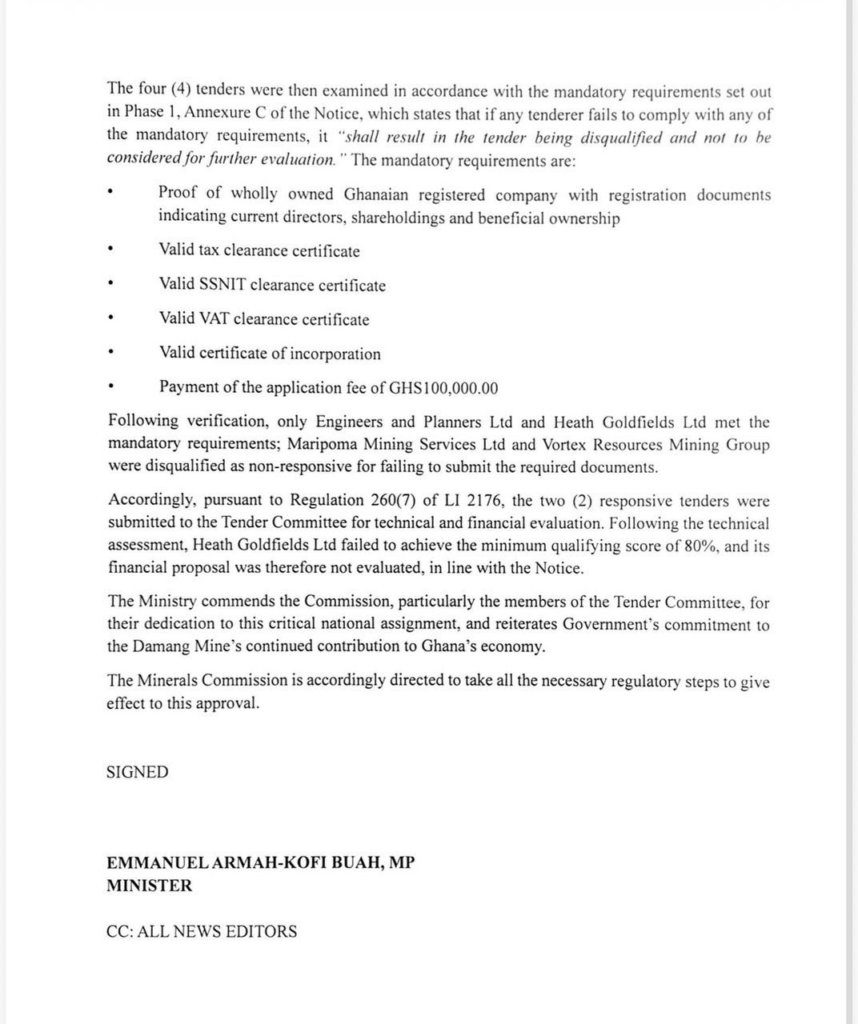 The Ministry commended the work of the Tender Committee and reiterated government’s commitment to ensuring that the Damang Mine continues to contribute meaningfully to the national economy.