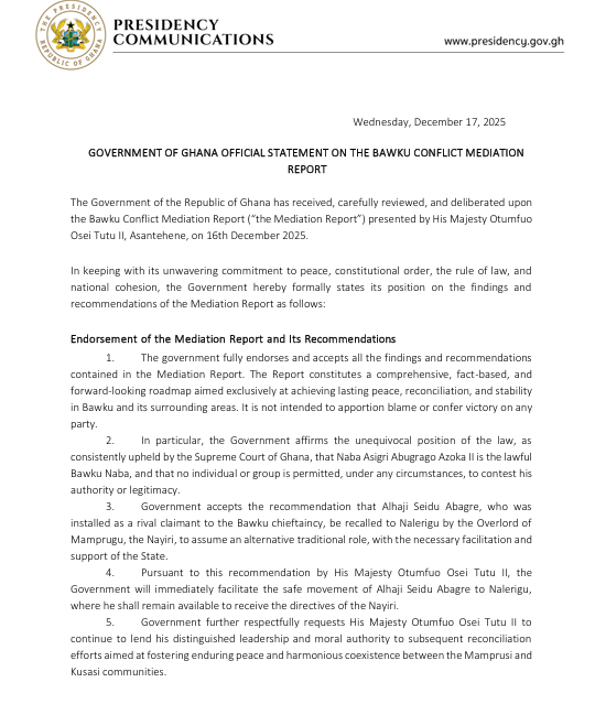 The Government of Ghana has fully endorsed the Bawku Conflict Mediation Report presented by the Asantehene, Otumfuo Osei Tutu II, describing it as a comprehensive roadmap for lasting peace and reconciliation in Bawku and its surrounding areas.