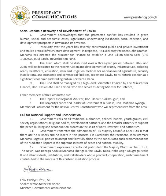 To address the socio-economic impact of the prolonged conflict, President John Dramani Mahama has directed the establishment of a GH¢1 billion Bawku Revitalisation Fund. The fund, to be disbursed between 2026 and 2028, will support development in infrastructure, health, education, irrigation, security, and commerce.