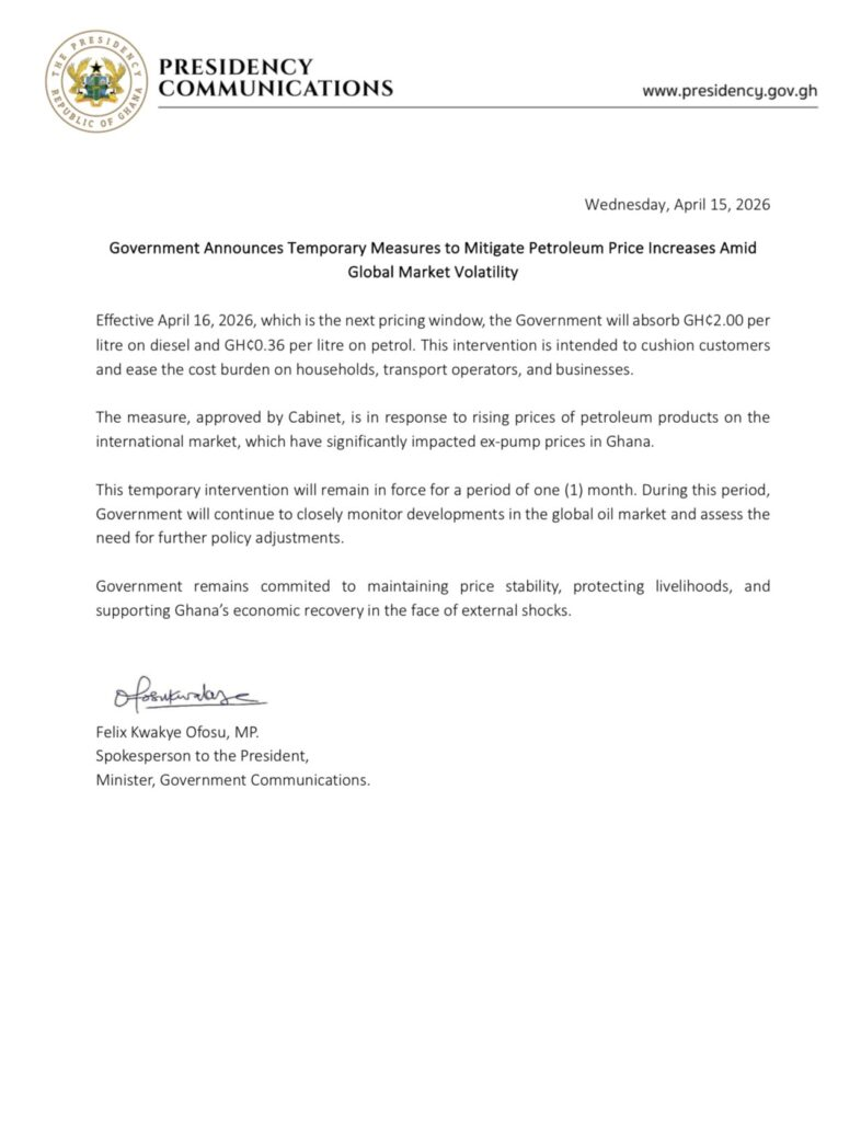 The decision was announced in a statement issued on Wednesday, April 16, by the Minister for Government Communications, Felix Kwakye Ofosu. According to the statement, the move responds to sharp increases in global oil prices, which have contributed to higher ex-pump prices locally and impacted transport fares and economic activity.