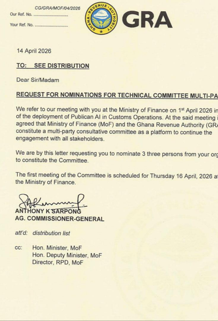 The Ghana Revenue Authority (GRA) has requested nominations from stakeholders to form a multi-party technical committee to support ongoing discussions on the deployment of the Publican AI system in customs operations.