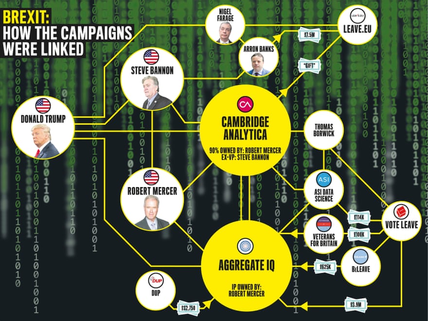 It was with AggregateIQ that Vote Leave (the official Leave campaign) chose to spend £3.9m, more than half its official £7m campaign budget. As did three other affiliated Leave campaigns: BeLeave, Veterans for Britain and the Democratic Unionist party, spending a further £757,750. “Coordination” between campaigns is prohibited under UK electoral law, unless campaign expenditure is declared, jointly. It wasn’t. Vote Leave says the Electoral Commission “looked into this” and gave it “a clean bill of health”.