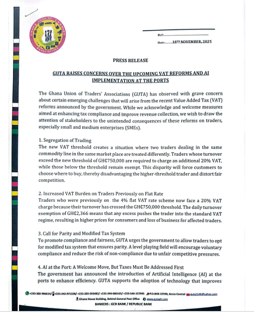 In a statement issued on November 18, 2025, GUTA said the new VAT threshold of GH₵750,000 creates an “unfair segregation” in the marketplace.