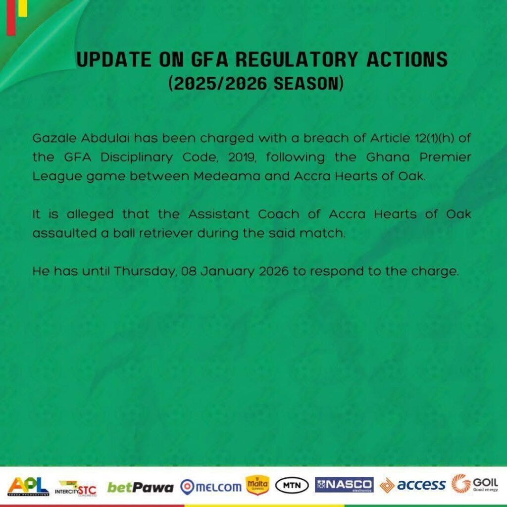 The Ghana Football Association (GFA) Disciplinary Committee has formally charged Hearts of Oak assistant coach Gazale Abdulai for allegedly assaulting a ball boy during their Premier League clash with Medeama SC at TNA Park.