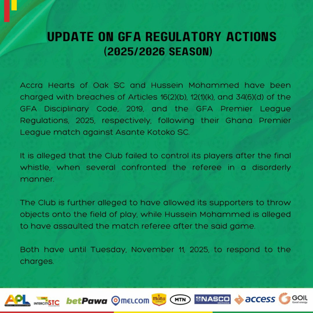 Both Hearts of Oak and Hussein Mohammed have been given until Tuesday, November 11, 2025, to submit their responses to the charges.