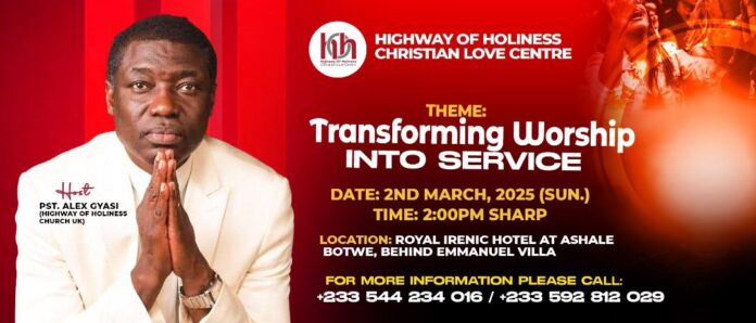 Highway of Holiness Church UK is set to host a transformational gathering on Sunday, March 2, at 2:00 p.m., focusing on the theme “Translating Worship into Service” to inculcate a culture of volunteering in the church.