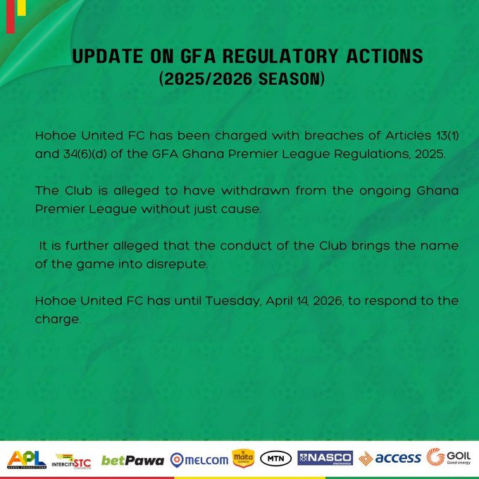 Hohoe United have been given until Tuesday, April 14, 2026, to formally respond to the charges.