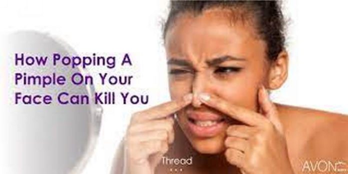Although rare, popping acne (pimple) in the “danger triangle”—previously known as the “triangle of death”—may cause an infection of the face or head. The “danger triangle” consists of the area from the corners of your mouth to the bridge of your nose.