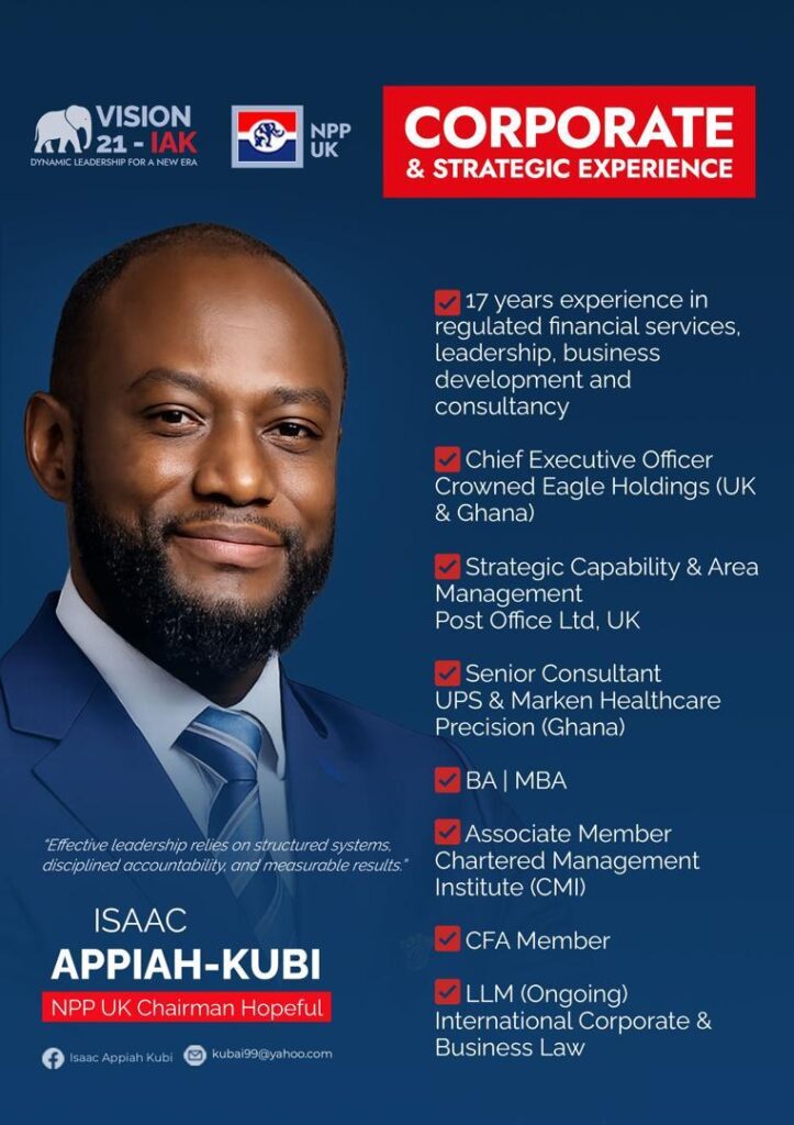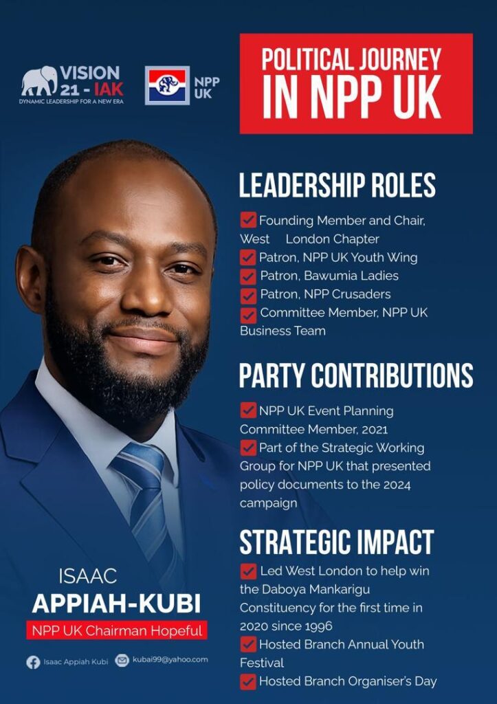 The race for the chairmanship of the New Patriotic Party (New Patriotic Party) UK Branch is gathering momentum as Isaac Appiah-Kubi has officially declared his candidacy, positioning himself as a contender focused on strengthening leadership and deepening diaspora engagement.