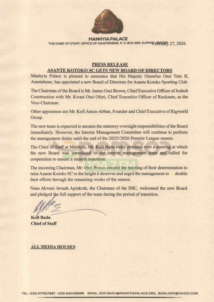 In a statement dated Friday, February 27, 2026, and signed by the Chief of Staff at Manhyia, Kofi Badu, the Palace said the restructured board will steer the strategic affairs of the Kumasi-based club as it seeks to consolidate its administrative framework.