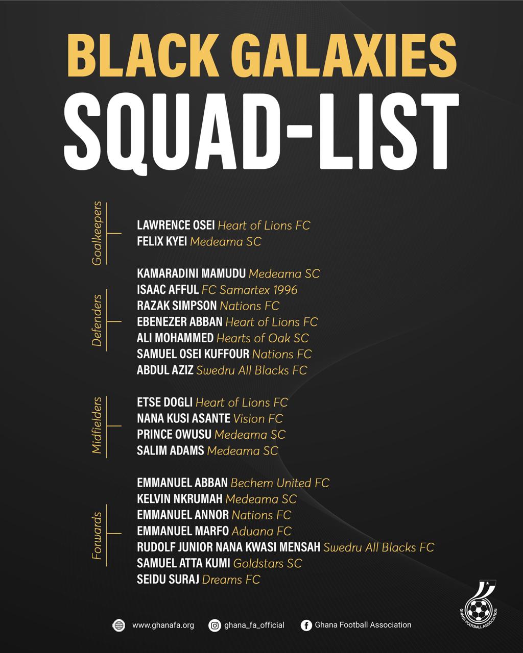 Ghana’s Black Galaxies coach, Kassim Mingle, has announced a 20-man squad for the international friendly against South Africa’s Bafana Bafana on Tuesday, 16 December 2025.