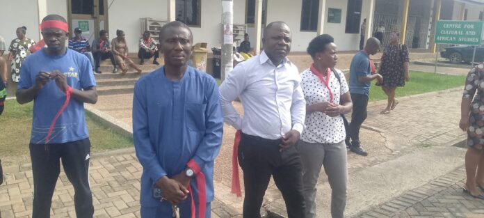The industrial action, which began on Tuesday, is being observed across all public universities in the country, including the KNUST, where members of the association, clad in red bands, gathered to urge their colleagues to stay at home until further notice.