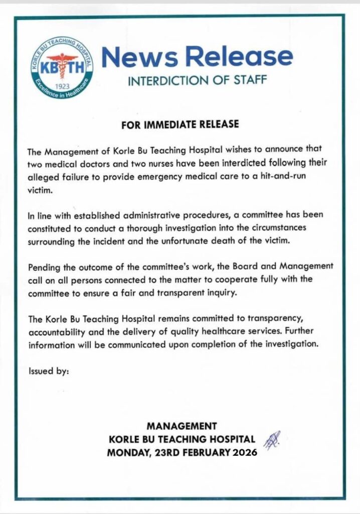 Management of the Korle Bu Teaching Hospital has interdicted two medical doctors and two nurses over their alleged failure to provide emergency medical care to a hit-and-run victim.