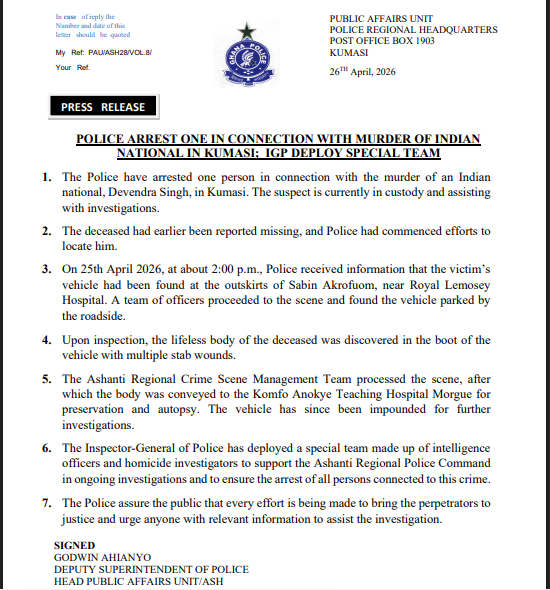 Police in Kumasi have arrested one person in connection with the murder of an Indian national, Devendra Singh, as investigations into the incident intensify.
