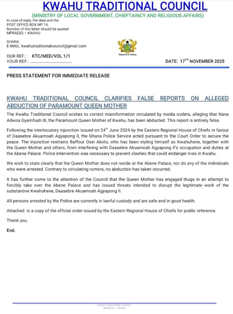 The Kwahu Traditional Council has dismissed reports suggesting that the Paramount Queen Mother, Nana Adwoa Gyamfuah III, was abducted, calling the claims baseless and misleading.
