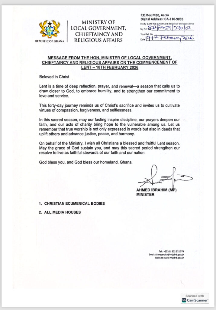 The Minister for Local Government, Chieftaincy and Religious Affairs, Ahmed Ibrahim, has extended warm wishes to Christians across the country as they begin the 2026 Lenten season, calling for deep reflection, prayer, and renewed commitment to faith and service.