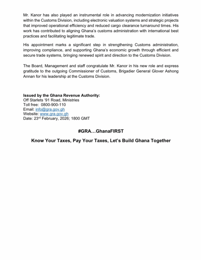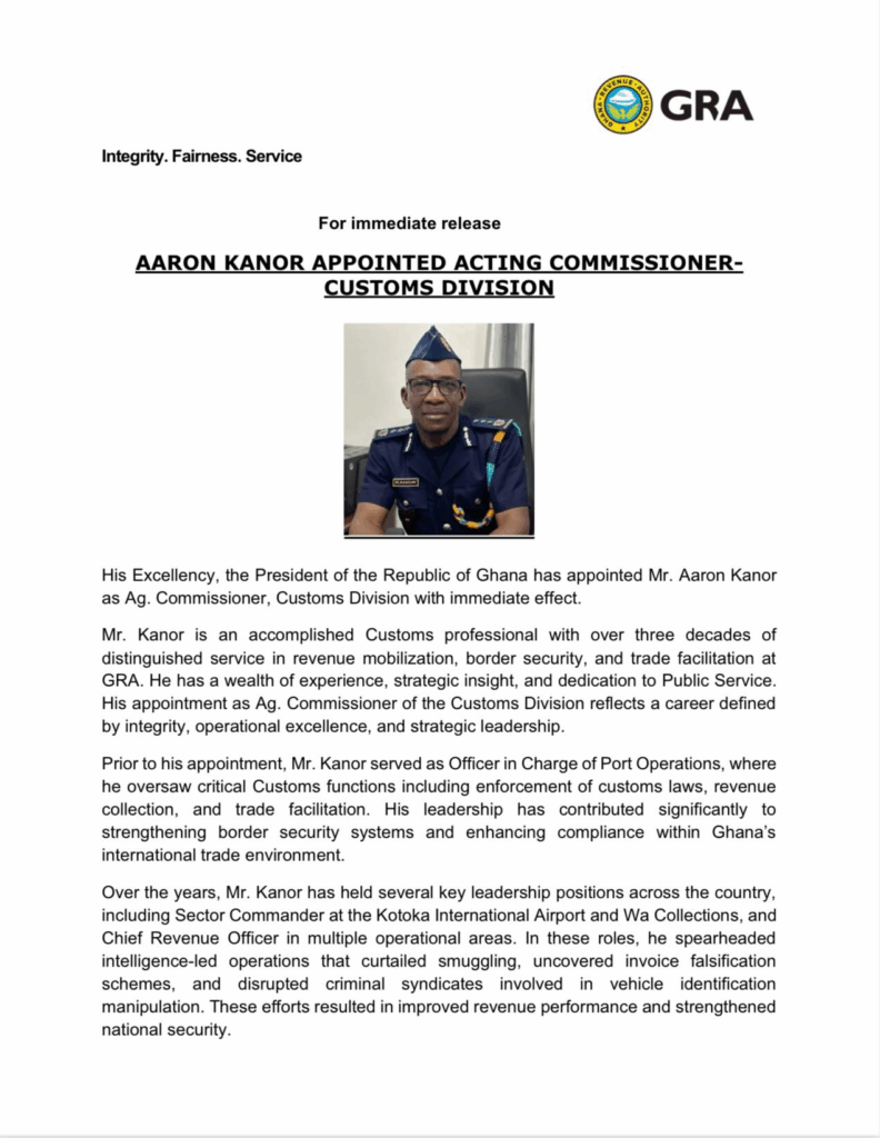 The statement characterised Mr. Kanor as a highly experienced Customs officer with more than 30 years of service in revenue mobilisation, border security and trade operations within the GRA.