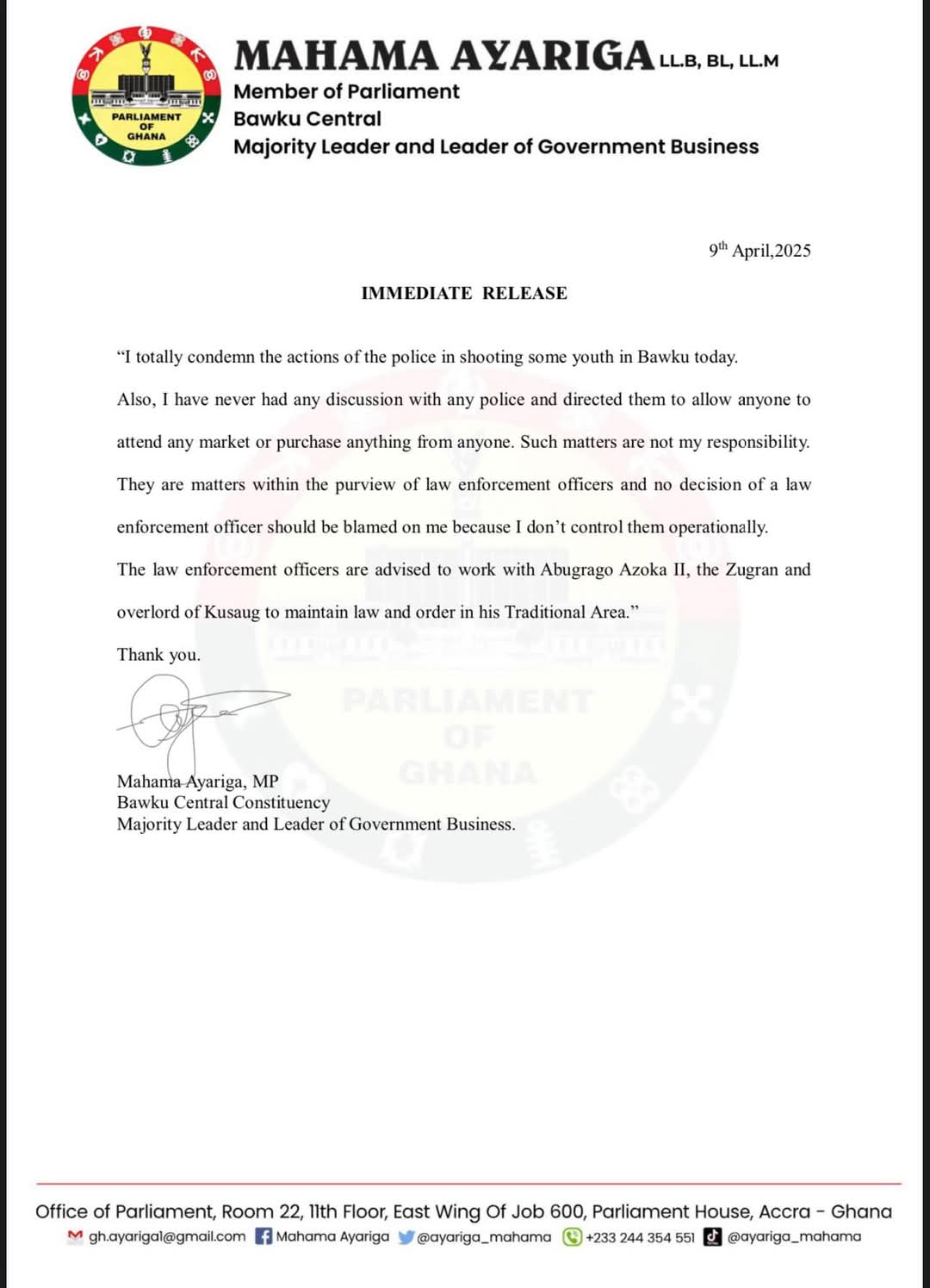 “I totally condemn the actions of the police in shooting some youth in Bawku today. Also, I have never had any discussion with any police and directed them to allow anyone to attend any market or purchase anything from anyone. Such matters are not my responsibility,” he stated.