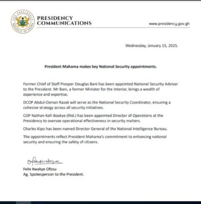 The statement also announced the appointment of COP Nathan Kofi Boakye (Rtd.) as the Director of Operations at the Presidency, tasked with overseeing operational effectiveness in security matters.