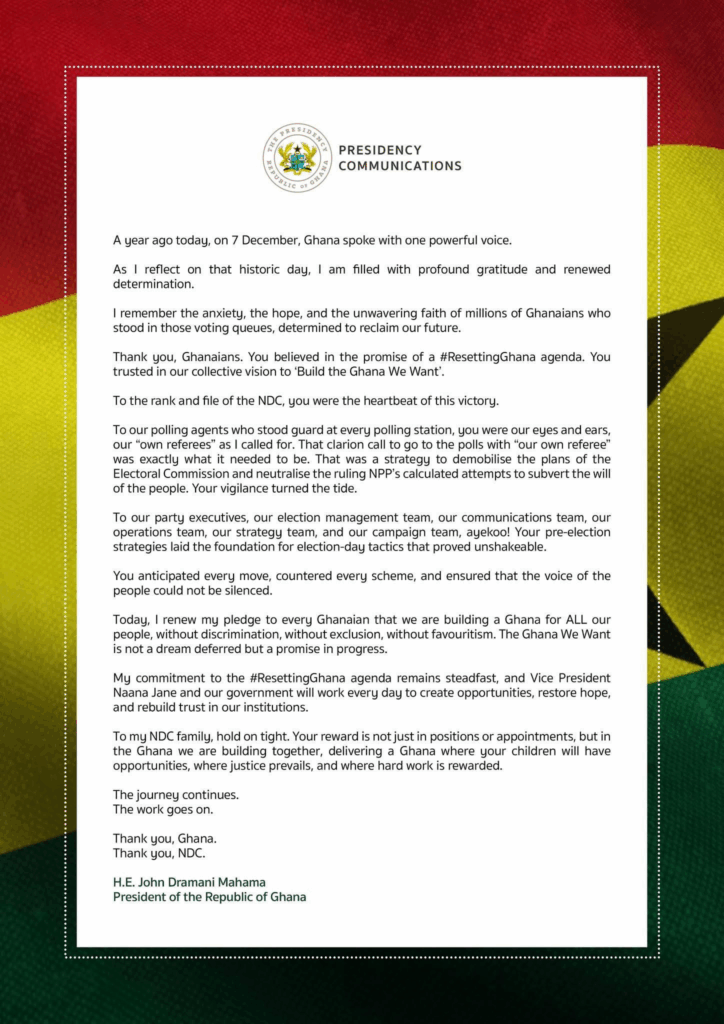 President John Dramani Mahama has marked the first anniversary of his December 7, 2024 election victory with a message of gratitude to Ghanaians and a renewed commitment to the Resetting Ghana agenda.