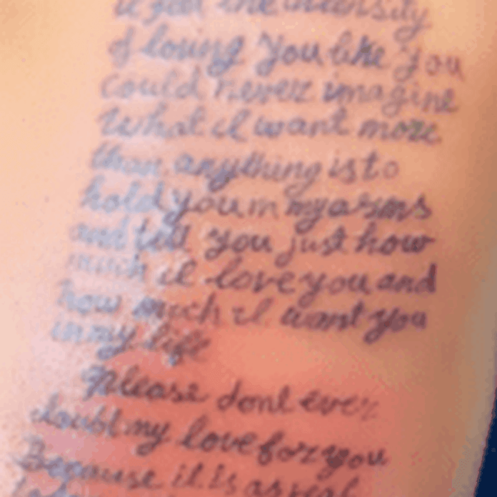 The latest to catch the eye of social media is a tattoo of the actress’ name and a full poem inscribed at the back of her German boyfriend.
