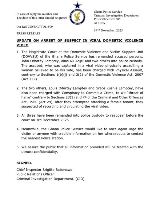 The update was issued in a statement signed by Chief Inspector Brigitte Babanawo, Public Relations Officer for the Criminal Investigation Department.