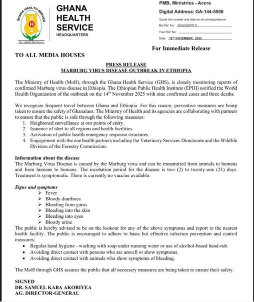 In a statement signed by Acting Director-General Dr. Samuel Kaba Akoriyea, GHS said the Ethiopian Public Health Institute (EPHI) notified the World Health Organization (WHO) on November 14, 2025, of nine confirmed cases and three deaths.