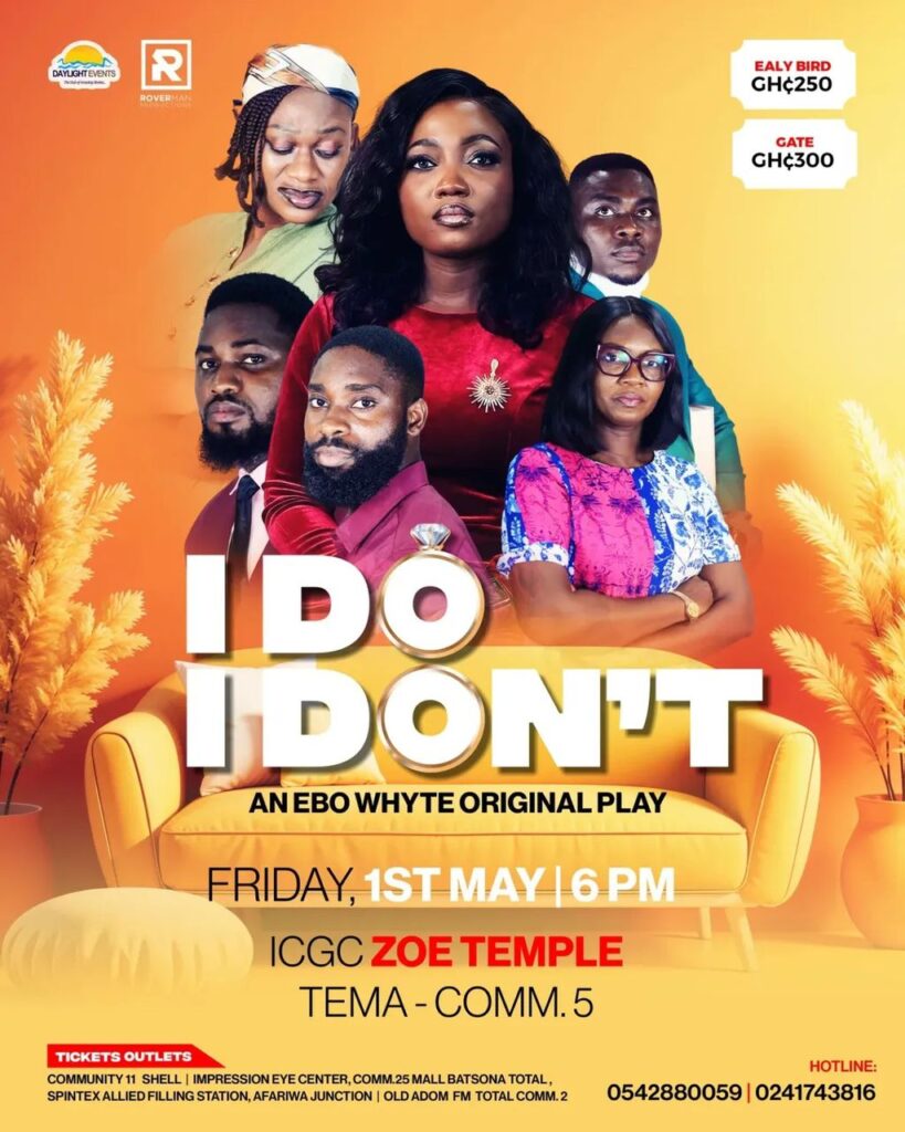 The production, I Do I Don’t, will be restaged on May 1 at 6:00 pm at ICGC Zoe Temple, Tema Community 5. Early bird tickets are selling at GHS 250, while gate admission is GHS 300.