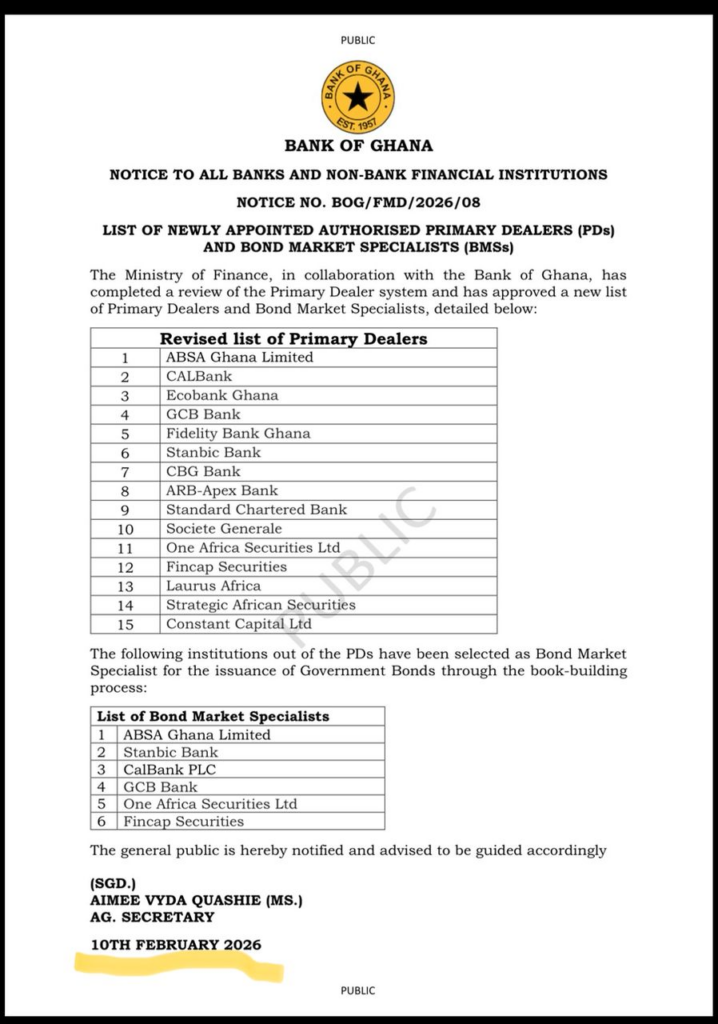 For clarity, the Bank of Ghana, in collaboration with the Ministry of Finance, issued an official notice dated February 10, 2026 (NOTICE NO. BOG/FMD/2026/08), which provides the revised and authoritative list of current Primary Dealers (PDs) and Bond Market Specialists (BMSs).