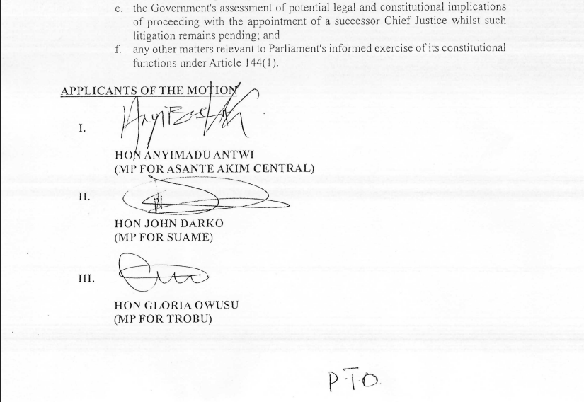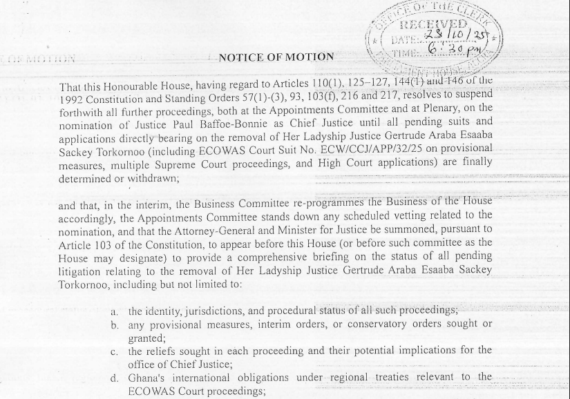 The Minority in Parliament has filed a motion calling for the suspension of all proceedings related to the nomination of Justice Paul Baffoe-Bonnie as Chief Justice until ongoing legal cases challenging the removal of Chief Justice Gertrude Araba Esaaba Sackey Torkornoo are concluded.