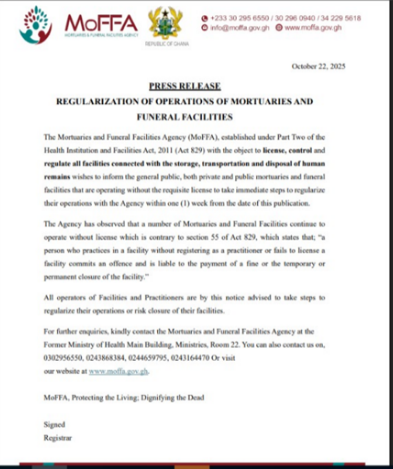MoFFA, which was established under Part Two of the Health Institutions and Facilities Act, 2011 (Act 829), is mandated to license, control, and regulate all establishments involved in the storage, transportation, and disposal of human remains.