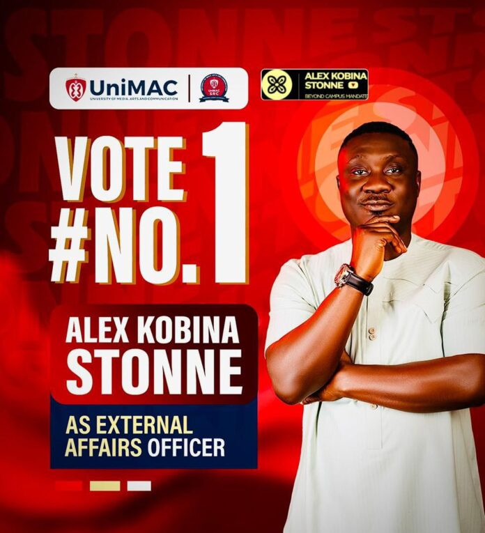 Sports journalist with the Adom Brands of the Multimedia Group Limited, Alex Kobina Stonne, is contesting for the Student Representative Council (SRC) External Affairs officer role at the University of Media, Arts and Communication (UNIMAC).