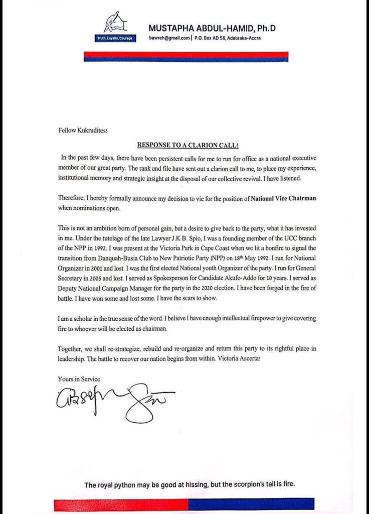Former Chief Executive Officer of the National Petroleum Authority (NPA), Mustapha Abdul-Hamid, has officially declared his intention to contest for the position of National Vice Chairman of the New Patriotic Party (NPP) when nominations open.