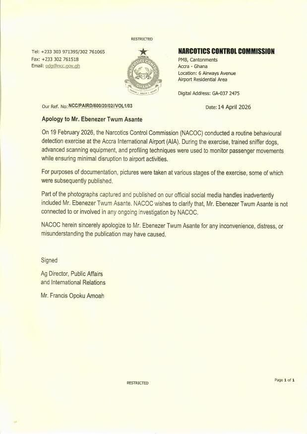 In a letter dated April 14, 2026, the Commission clarified that Mr Asante has no links to any ongoing narcotics investigation, describing the publication as an error.