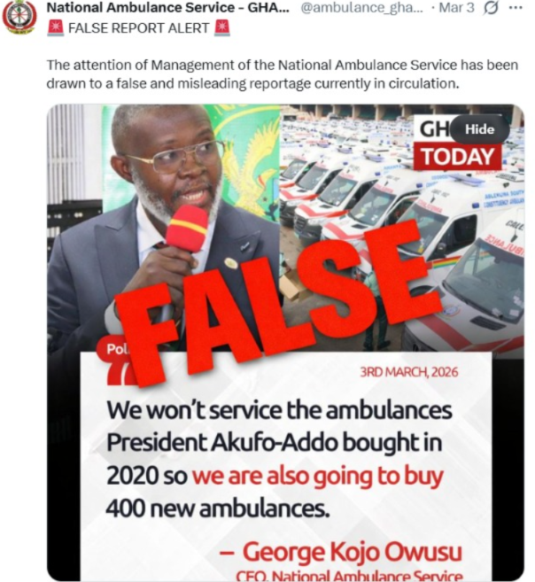The Chief Executive Officer of the National Ambulance Service (NAS), Dr. George Kojo Owusu, has dismissed reports suggesting that the Service will not repair its existing ambulances, describing the claims as false and misleading.
