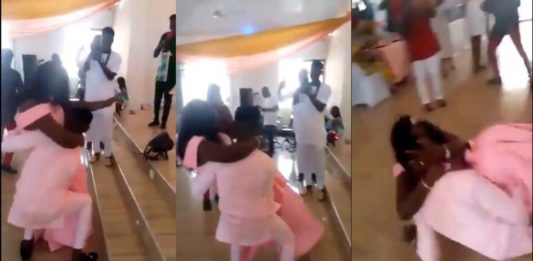 A video fast circulating online has captured moments a newly wedded couple fell flat at their wedding ceremony. The two were seen happily dancing in the church auditorium as their guests cheer on in amusement. However, the groom, in an attempt to prove his manpower, tried to lift the bride who appeared heavier than him. … Continue reading Newlyweds fall flat while dancing at their wedding [Video]