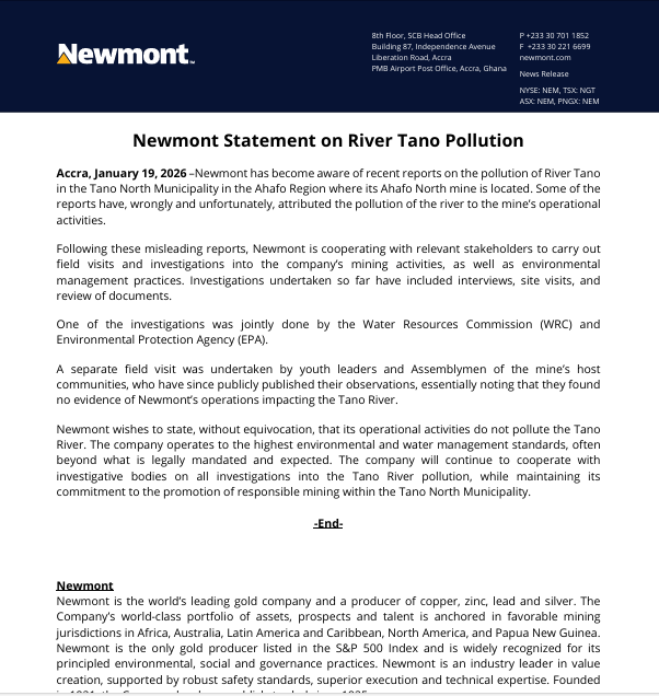In a statement issued on January 19, 2026, the company said reports linking the pollution to its Ahafo North mine are misleading and unfounded.
